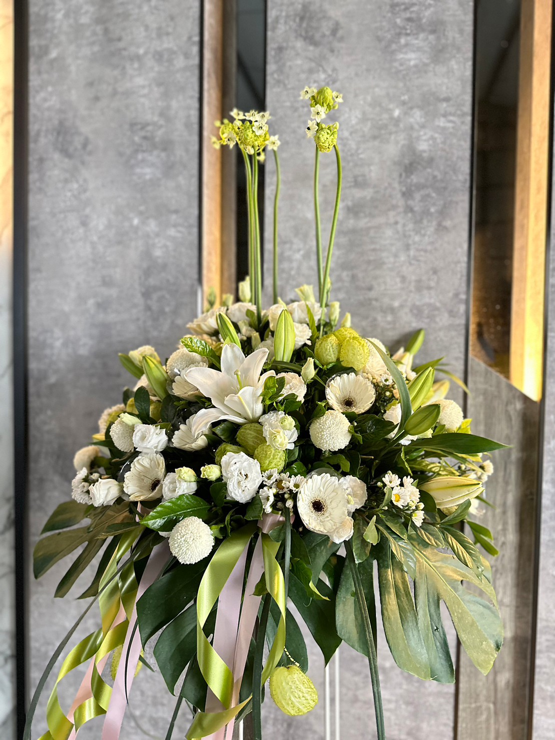 3. 花材若因季節性或其他不可抗力因素短缺,將以當令相等花材代替,以達相同效果。圖片中花器或配飾用品,皆屬示意圖。將會依照現場進行花色、花卉及盆器調整。86歲以上往生者將會採用部分紅花代表喜喪呈現。如欲更換、指定花色,請於結帳頁面備註告知。